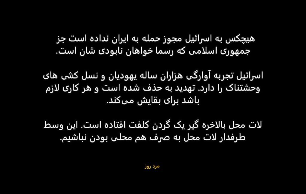حمله اسرائیل به ایران یک جنگ تحمیلی دیگر است که جمهوری اسلامی در درجه اول مسئولش است. اگر وطن دوست هستیم با عامل اصلی ویرانی ها و جنگها و بلایایی که بر کشور رفته است روبرو شویم.