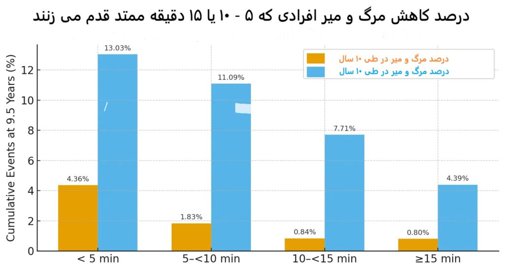 یکی از تحقیقات جدید که نحوه راه رفتن ۳۳ هزار نفر ۴۰- تا ۷۹ ساله را برای حدود ۱۰ سال پیگیری کرده است نشان داد افرادی که حدود ۱۵ دقیقه مستمر قدم می زنند شانس مرگ ناشی از انواع بیماری ها ۶۰ درصد و بویژه در امراض قلبی، ۸۳ درصد کمتر از کسانی است که ۵ یا ۱۰ دقیقه قدم برمیدارند.