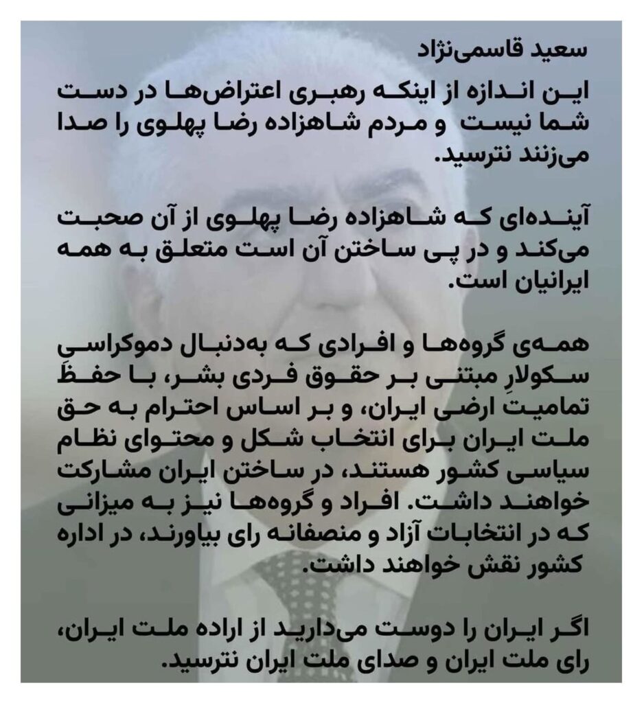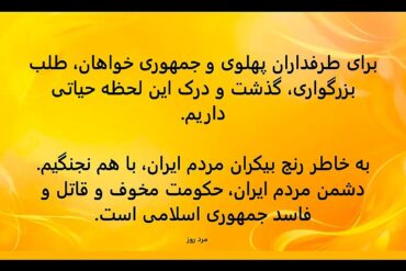 بیایید از ج. ا با هم عبور کنیم و بعد در طی سال های متمادی بعد از استبداد ج. ا و شکلگیری آزادی رسانه و آزادی احزاب و آزادی فردی، ایده های متفاوت بهروزی رو با شهروندان ایران در میان بگذاریم و به دمکراسی فرصت جانانه بدهیم.