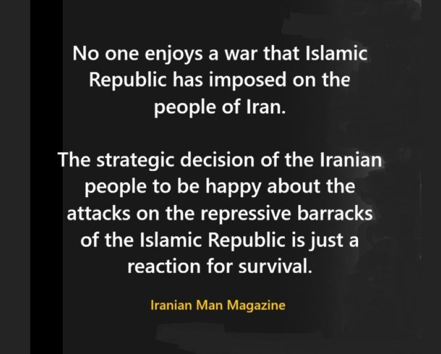 هیچکس لذت نمی برد از جنگی که ج. ا بر مردم ایران تحمیل کرده است. تصمیم استراتژیک مردم ایران برای شادی بابت ضربات به پادگانهای سرکوب جمهوری اسلامی و کشتن رهبران نظامی سیاسی شان فقط واکنشی است برای بقا.