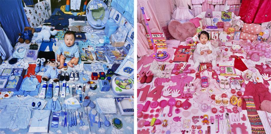 عکاس کره ای ساکن امریکا JeongMee Yoon می گوید با دیدن علاقه بی اندازه دختر 5 ساله ام به رنگ صورتی، بدون آنکه خودم کوچکترین نقشی در سلیقه اش داشته باشم مرا وا داشت تا پروژه « صورتی آبی» را تهیه کنم. مجموعه فوق ترکیبی است از  تصاویر بچه های امریکایی و کره ایی که در کنار وسایل و اسباب بازی های صورتی و آبی برداشته شده است.