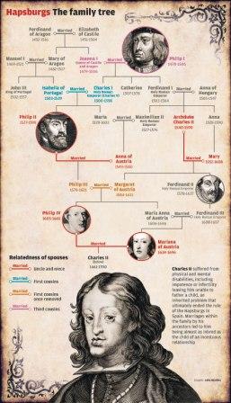 چارلز دوم پادشاه اسپانیا موجود بسیار صدمه دیده ایی به لحاظ ژنتیک بود. او و تمام مردان خانواده هابسبورگ به داشتن چانه های بسیار نوک تیز و دراز، شهرت داشتند. در حقیقت، عقب ماندگی ذهنی، ناتوانی جسمی و  جنسی و مرگ وی در ۳۸ سالگی، باعث انقراض نسل مردان خانواده سلطنتی شد.